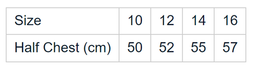 | Half Chest (cm) | 59 | 61 | 63 | 65 | 67 | 69 |